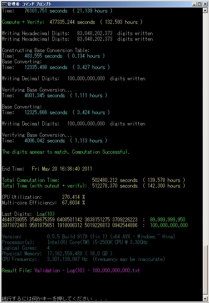 | May 20, 2011 | Shigeru Kondo | 100,000,000,000 | Intel Core i7 2500K @ 4.8 GHz 16 GB DDR3 + 6 x 1 TB |