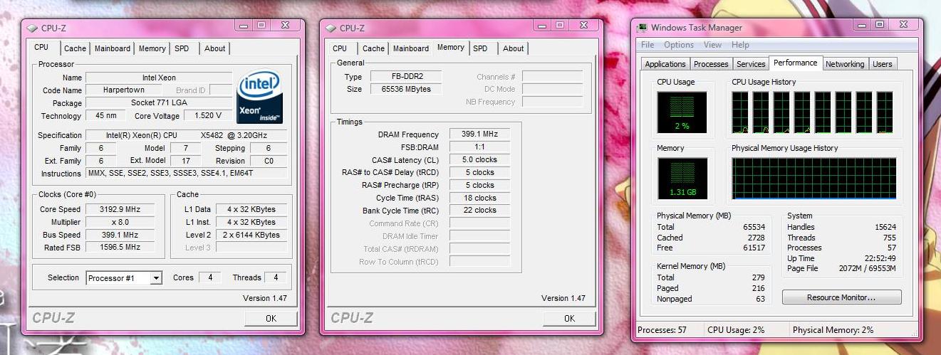 - 64 GB DDR2 FB-DIMM @ 800 MHz (quad channel)