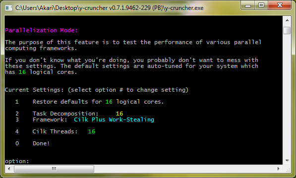 The task decomposition tells the program to decompose the computation into N independent tasks. This number is a suggestion and not a guarantee. y-cruncher may create fewer or more tasks depending on the situation.