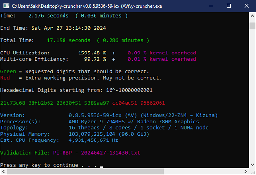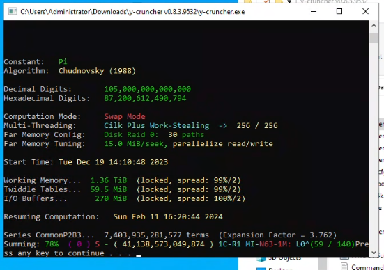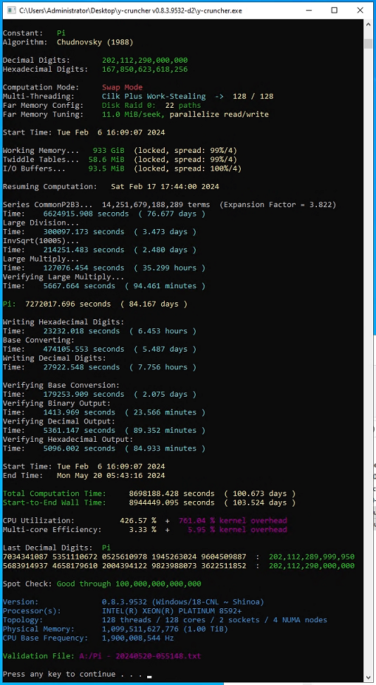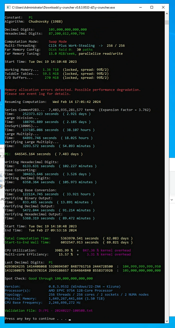 Overall, this was a really fast computation relative to its size. And there were no errors or other complications. So y-cruncher's fault tolerance wasn't even tested this time.