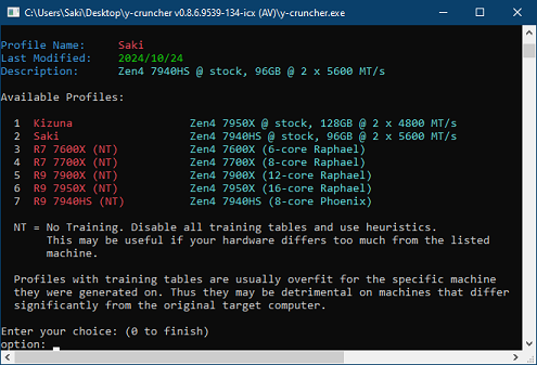 To help combat that problem, v0.8.6 will add support for tuning profiles. These are profiles within each binary that you can select from. For example, the Zen4 binary (22-ZN4) has two main profiles: One for the desktop 7950X and one for the laptop 7940HS.
