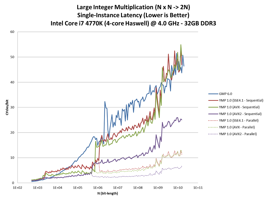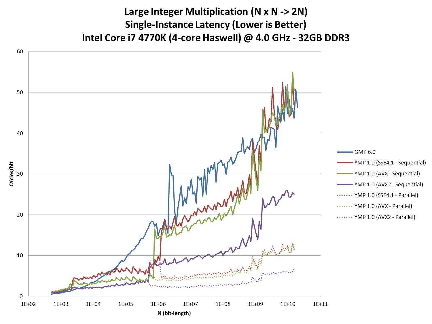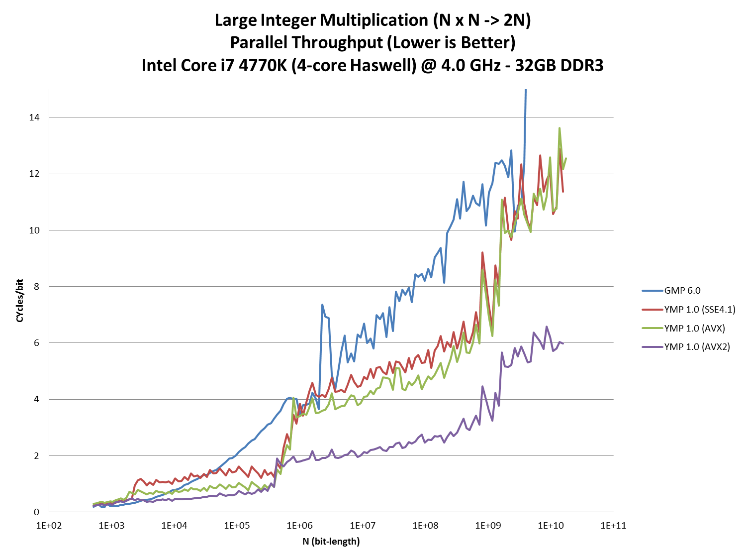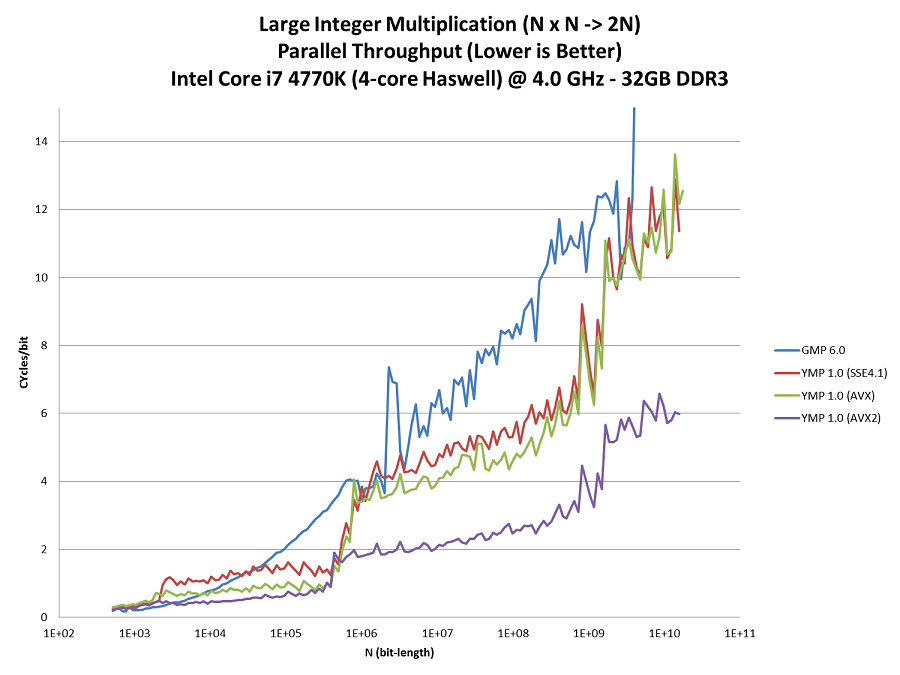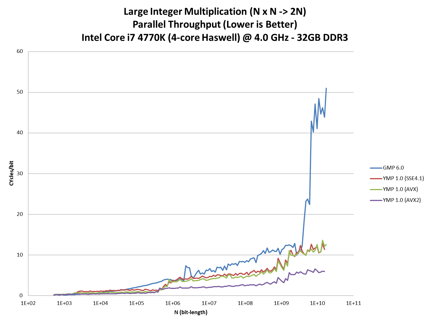 Since everyone loves to use GMP as a baseline for bignum performance, we will do the same. But be aware that these benchmarks are not exactly apples-to-apples comparisons. GMP is a sequential program that supports no parallelism. YMP is both threaded and vectorized.